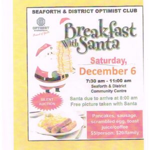 Join the Seaforth and District Optimist Club on December 6th from 7:30 a.m. to 11:00 a.m. at the Seaforth & District Community Centre for a festive morning the whole family will enjoy!